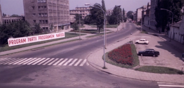 Krótki dzień pracy (1981, dettaglio) di Kieślowski. ‘Il programma del partito è il programma della nazione’. Sullo sfondo, manifestanti in arrivo.